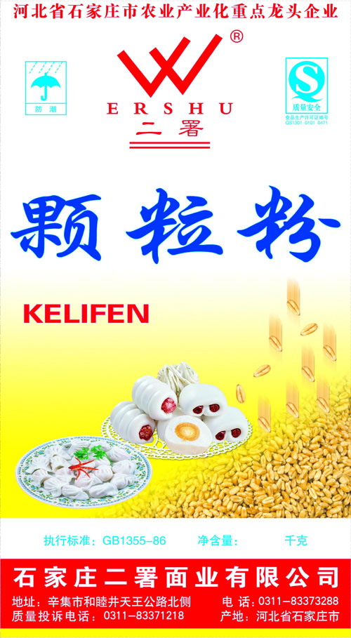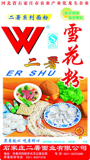 河北面業(yè)         二署面業(yè)有限公司創(chuàng)建于1989年,現(xiàn)已具備日處理小麥300噸的能量,產(chǎn)品質(zhì)量穩(wěn)定,深受客戶青睞。 二署面業(yè)地理位置優(yōu)越,北靠307國道石黃高速,南鄰石德鐵路,衡井國道,交通十分方便,為貨物運輸提供保證及時運輸?shù)奶烊粭l件。產(chǎn)品運銷:黑龍江、吉林、遼寧、河北、內(nèi)蒙、陜西、山西等大中省份,贏得了廣大消費者的認可。 河北面業(yè)